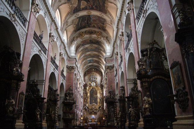 The style in the churches is distinctively Baroque with gilded statues and pink frescoes. The strings and organs echo against these adorned walls. It is truly a quintessential Prague experience.