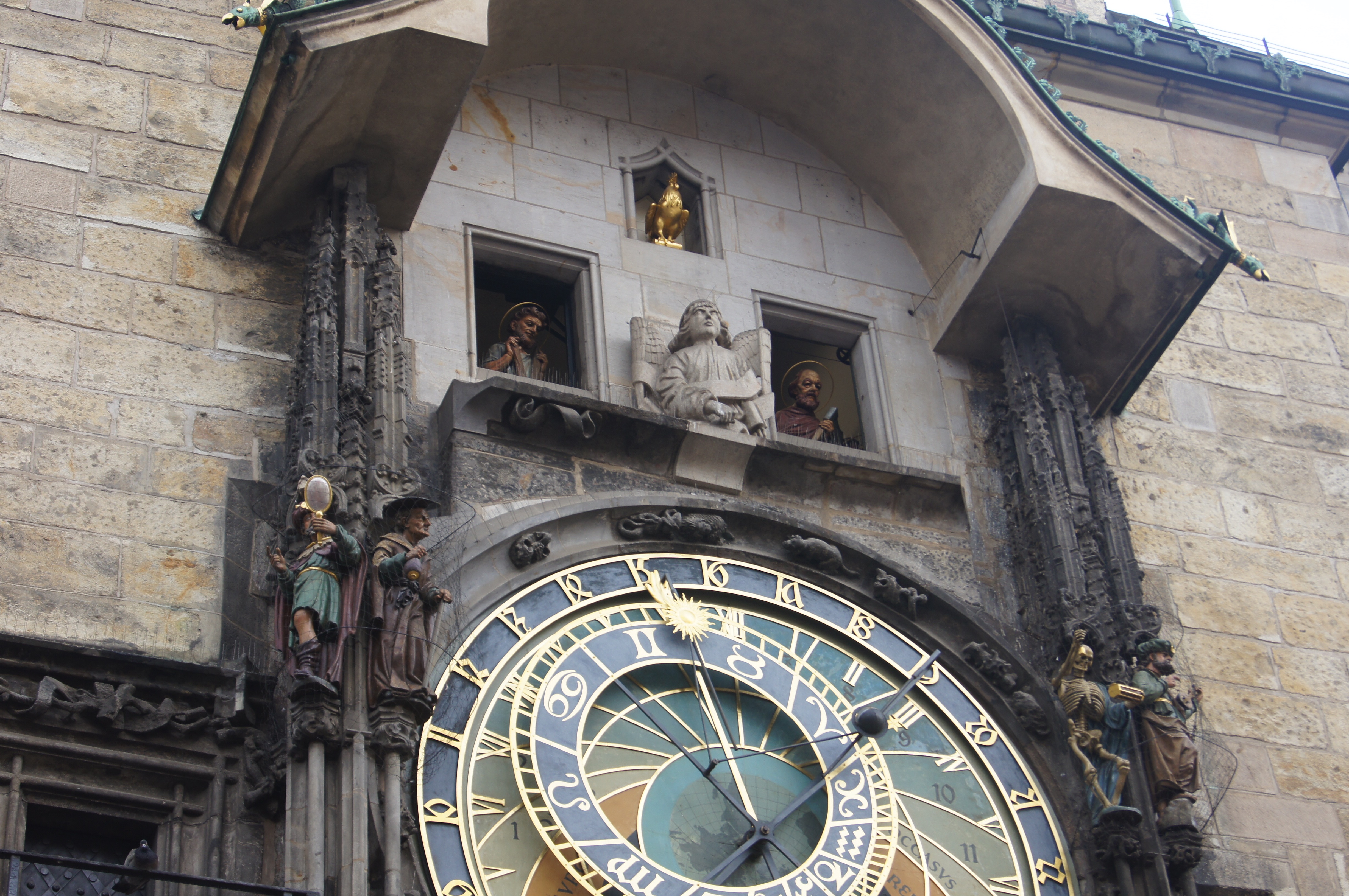 The Orloj (astronomical clock) is mounted on the southern wall of Old Town Hall in the Old Town Square. The clock mechanism itself is composed of three main components: the astronomical dial, representing the position of the Sun and Moon in the sky and displaying various astronomical details; “The Walk of the Apostles”, a clockwork hourly show of figures of the Apostles and other moving sculptures—notably a figure of Death (represented by a skeleton) striking the time; and a calendar dial with medallions representing the months. Tourists crowd here on the hour to great the apostles and subsequently death.
