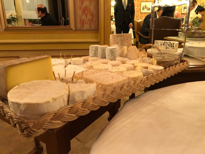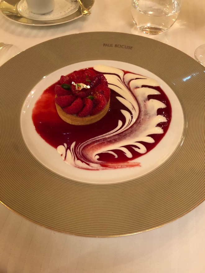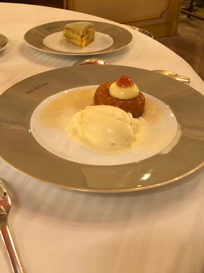 The dinner service is the stuff of miracles. The menu comes with options for number of courses. The amazing thing is that the quintessential Paul Bocuse remains on the menu, decades later, from the Truffle Soup served to the French President in 1975 with a bulbous puff pastry floating on top of the soup bow, to the Sea Bass Stuffed in Puff Pastry, in which the puff resembles the outside of the fish scales and all, to the Bresse Chicken Cooked in a Sheep’s Bladder. These are the dishes that must be perfect every night, year-over-year, decade-after-decade. We had the scallop of fois gras, quenelle of pike and crayfish, sea bass in puff pastry, cheese and dessert.