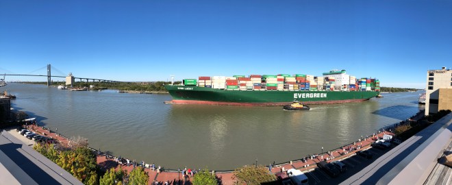 Recommended by our waiter at Emporium, Top Deck offers the best views of Savannah’s river-front and, due to the large container ships that dock just a short distance up river at the Port of Savannah, brings excitement to all from a 5-story container ship coming up river. The drinks are reasonably priced and the daytime crowd is subdued over rounds of Rose.