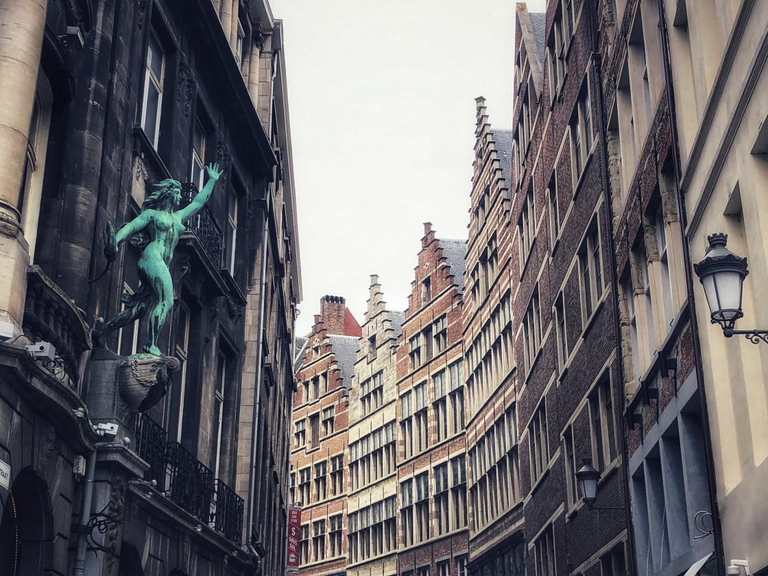 The centerpiece of the square, however, is the Brabo Fountain. It depicts the protagonist of Antwerp’s most famous legend of the mythical hero Brabo. According to the Legend, the giant Antigoon demanded a high toll for each ship that wanted to enter the city. If the ship’s crew did not want to pay the toll, their hands were cut off. The hero Brabo fought the giant, cut its hand and head and threw the hand in the river Scheldt. The gore is palpable in the fountain’s statue. Antigoon lays at the base with water spouting from his wounds and pouring out of his severed arm and head. The top of the fountain’s statue depicts Brabo throwing the giant’s hand in the river.
