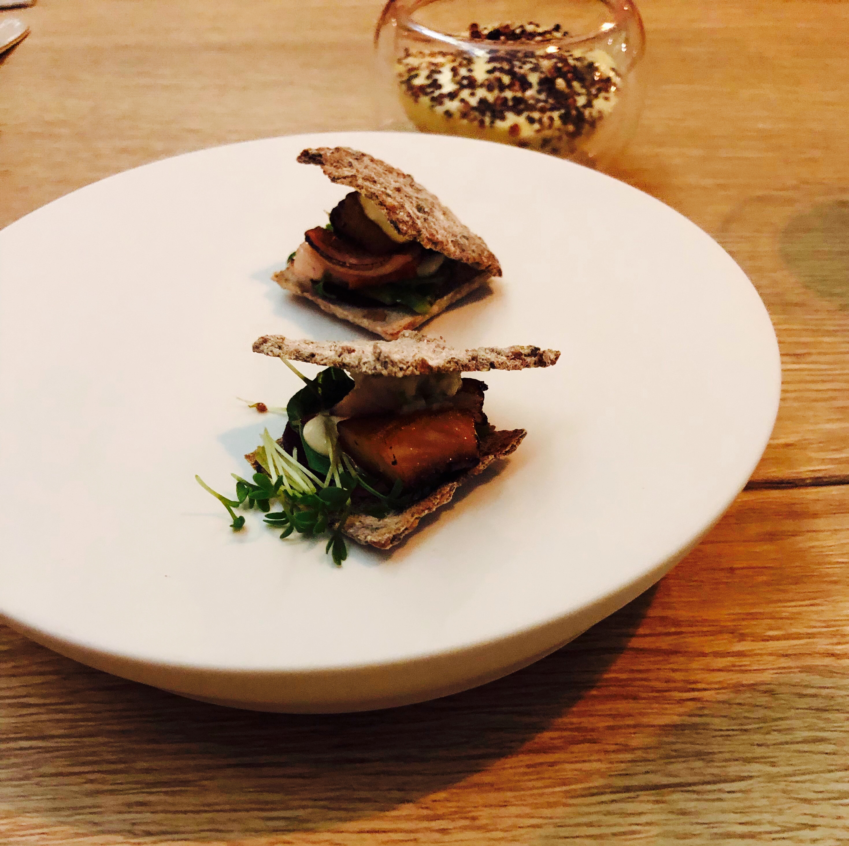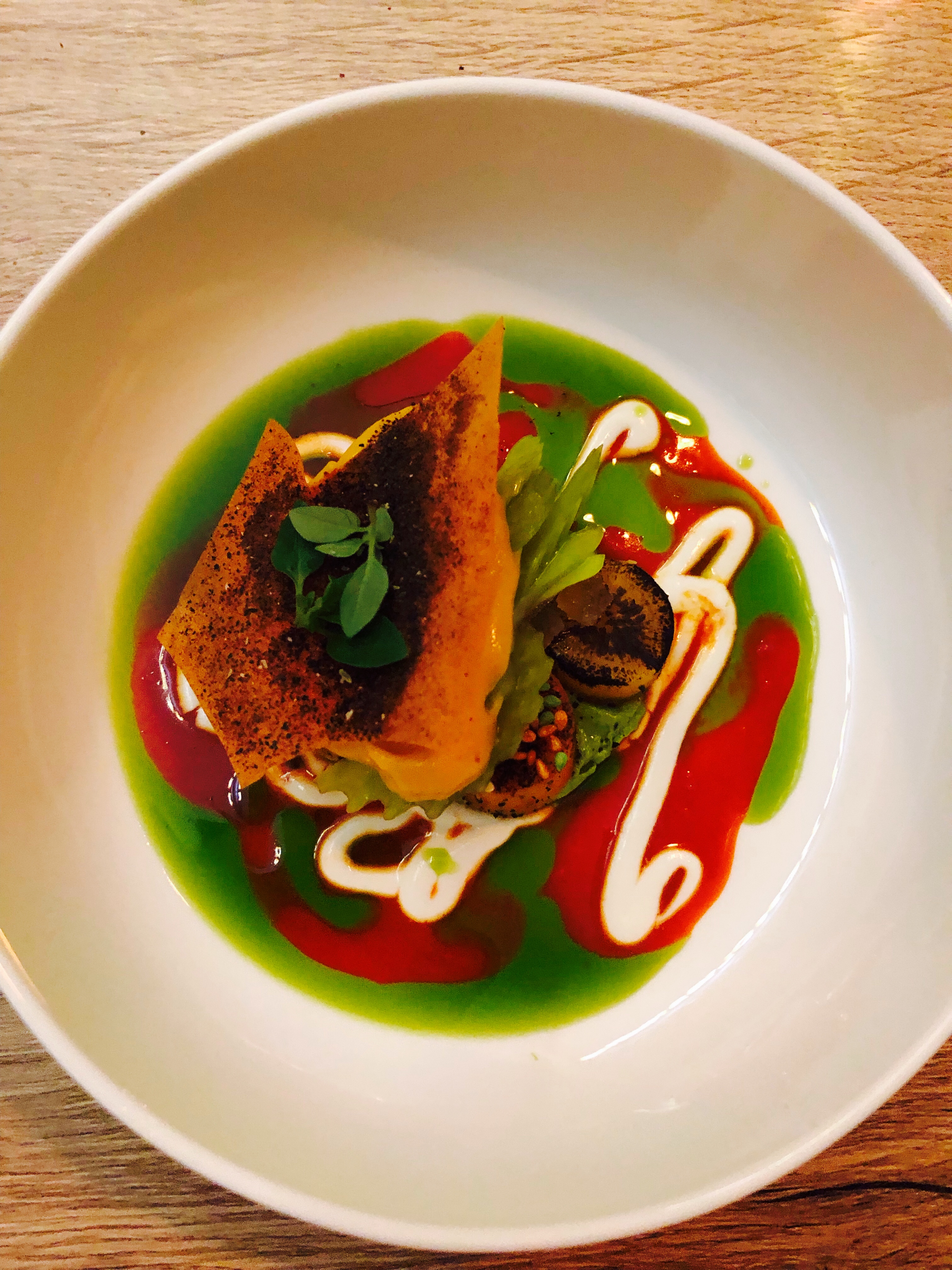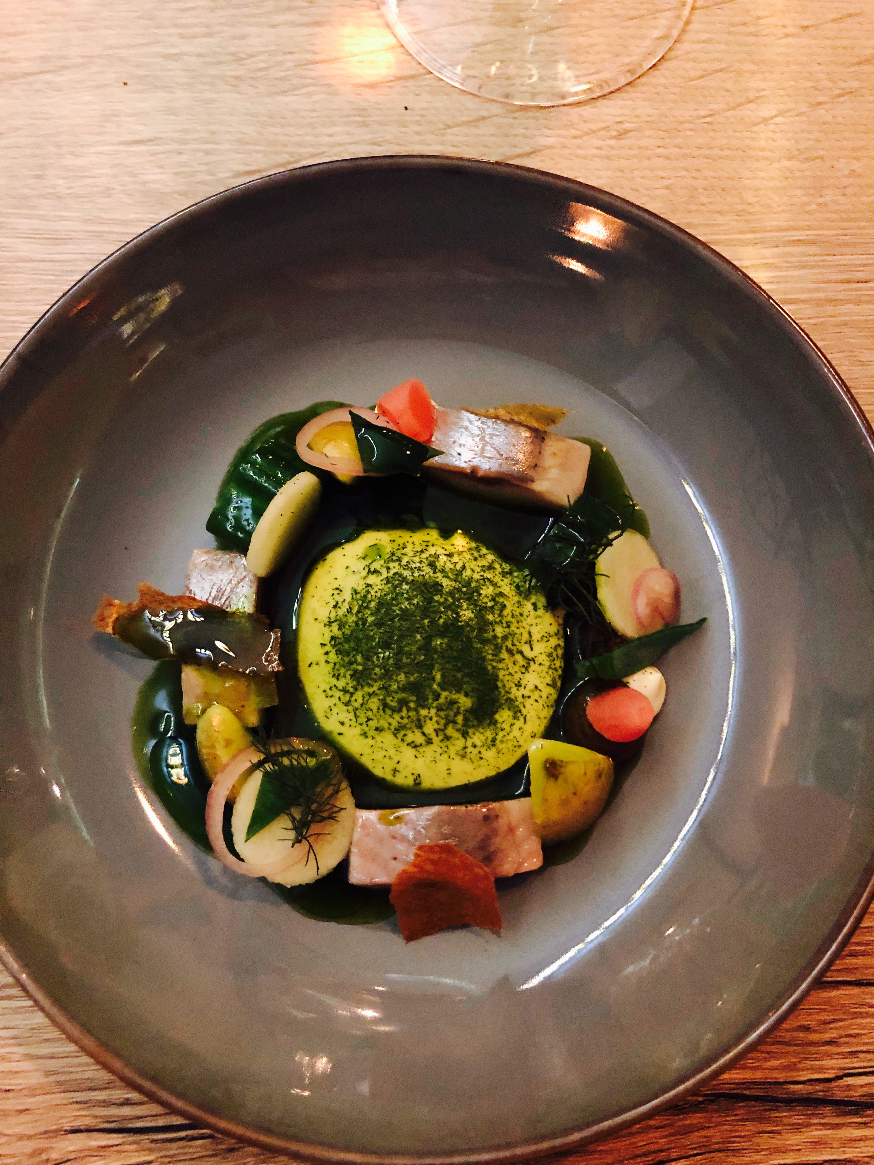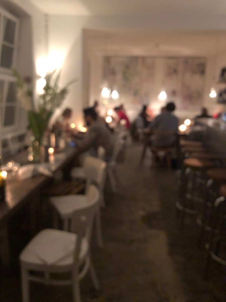 Cordo: located in the Mitte on a quiet residential street and one star in the Michelin guide, this restaurant packs a punch with a set menu in a casual setting (think comfy high tops near a dimly lit bar and inner courtyard or front room with fireplace facing the street) the stark white and grey plates are topped with a colorful panoply of ingredients showing off the kitchen’s refined technique.