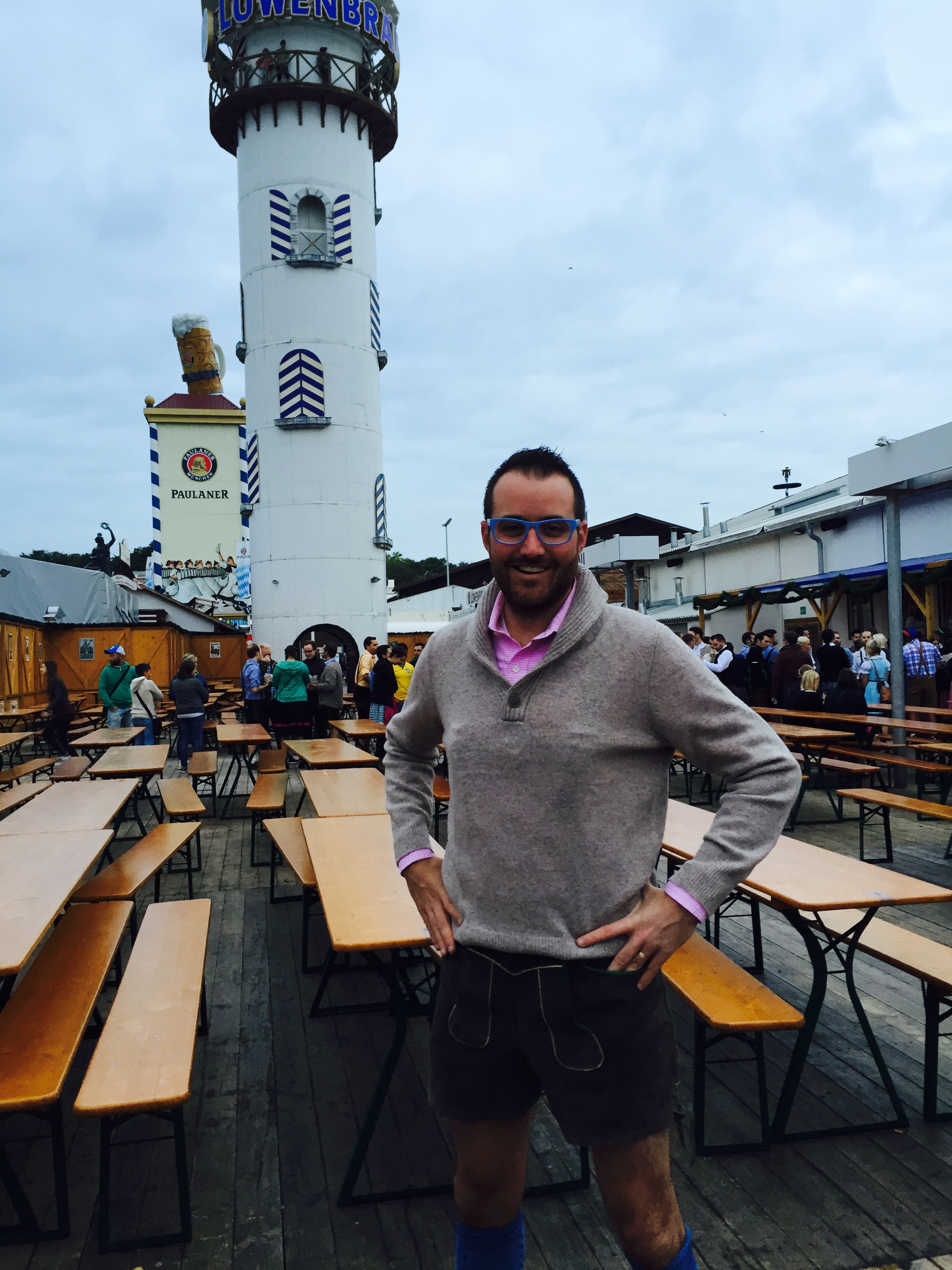 Dress the part, sing the songs, tip well, and eat. Jumping in head first to tradition, I wore the lederhosen of my father in law, acquired in the 1970s these are leather, tight, and short. Think of the NBA in the 70s and you get my drift. Emily and our female friends wore dirndls, which consist of a bodice, skirt, apron, and blouse (knee length and below is appropriate). Some of the best times we had were doing little polkas while standing on the benches. And every other song followed by Ein Prosit, the cheersing song!