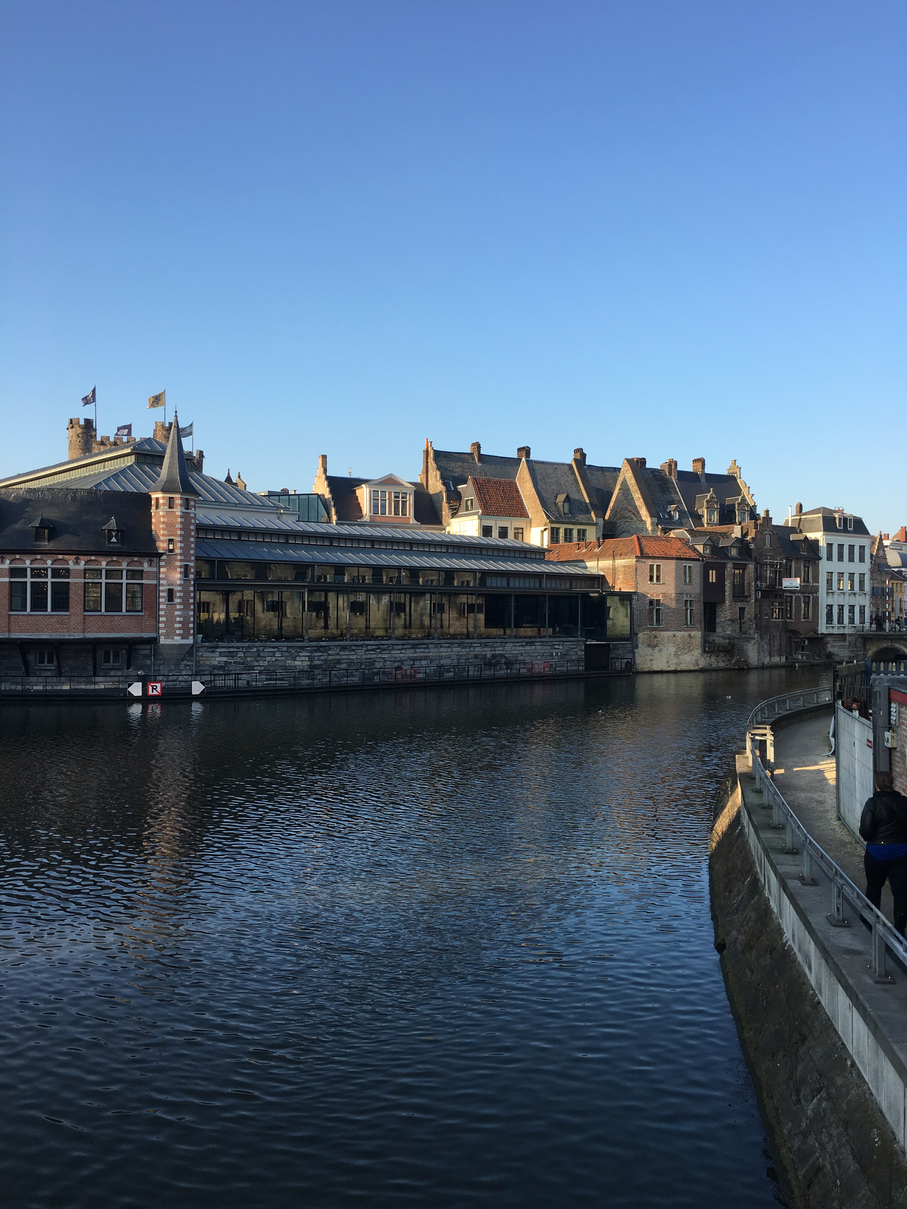 Practical Tips. Ghent is possible to sightsee and get a feel for in a day as the old city is amazingly compact with most of the “must see” sights within a 30 minute walk. Arrival is straightforward: exit the train station toward the signs for the trams and city buses, walk about 100 yards diagonally left to the tram stop, and wait for Tram #1. Take this tram 15 minutes to the Korenmarkt stop. This is where Ghent opens up in front of you.