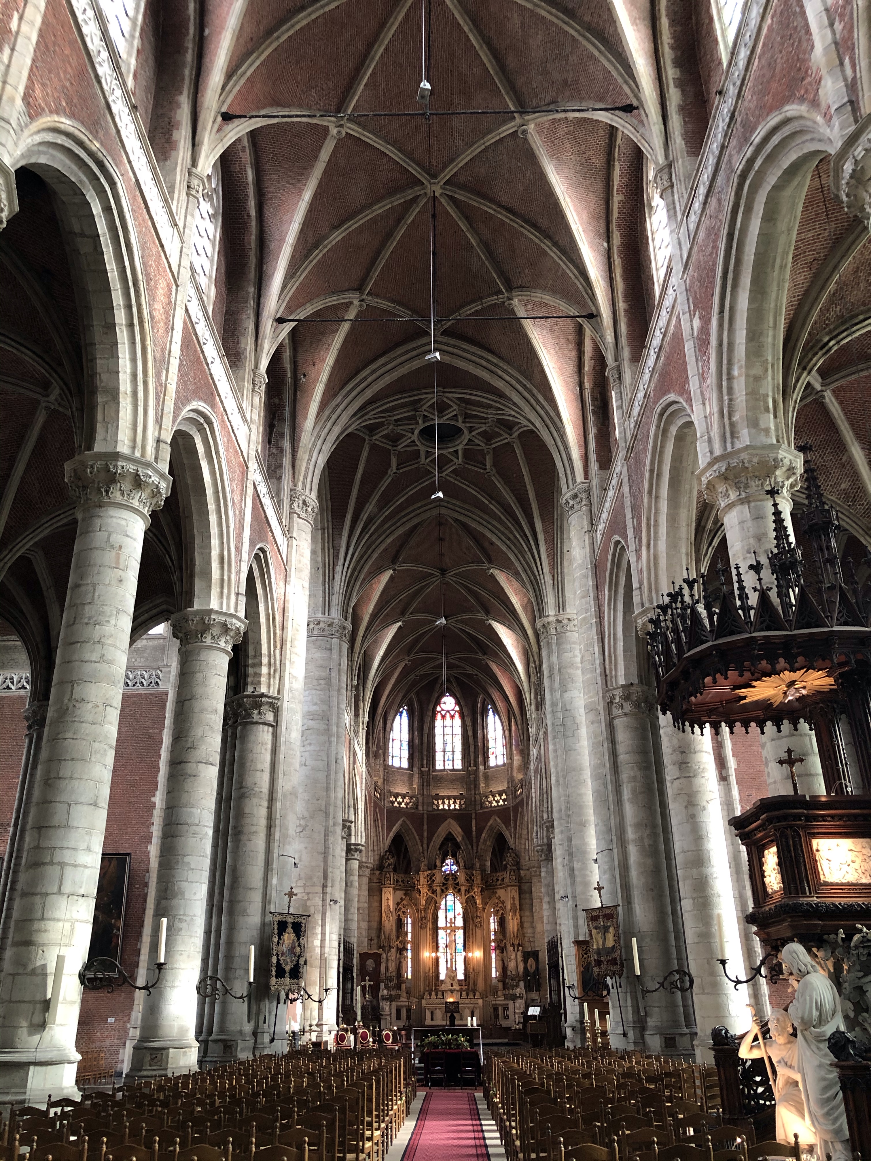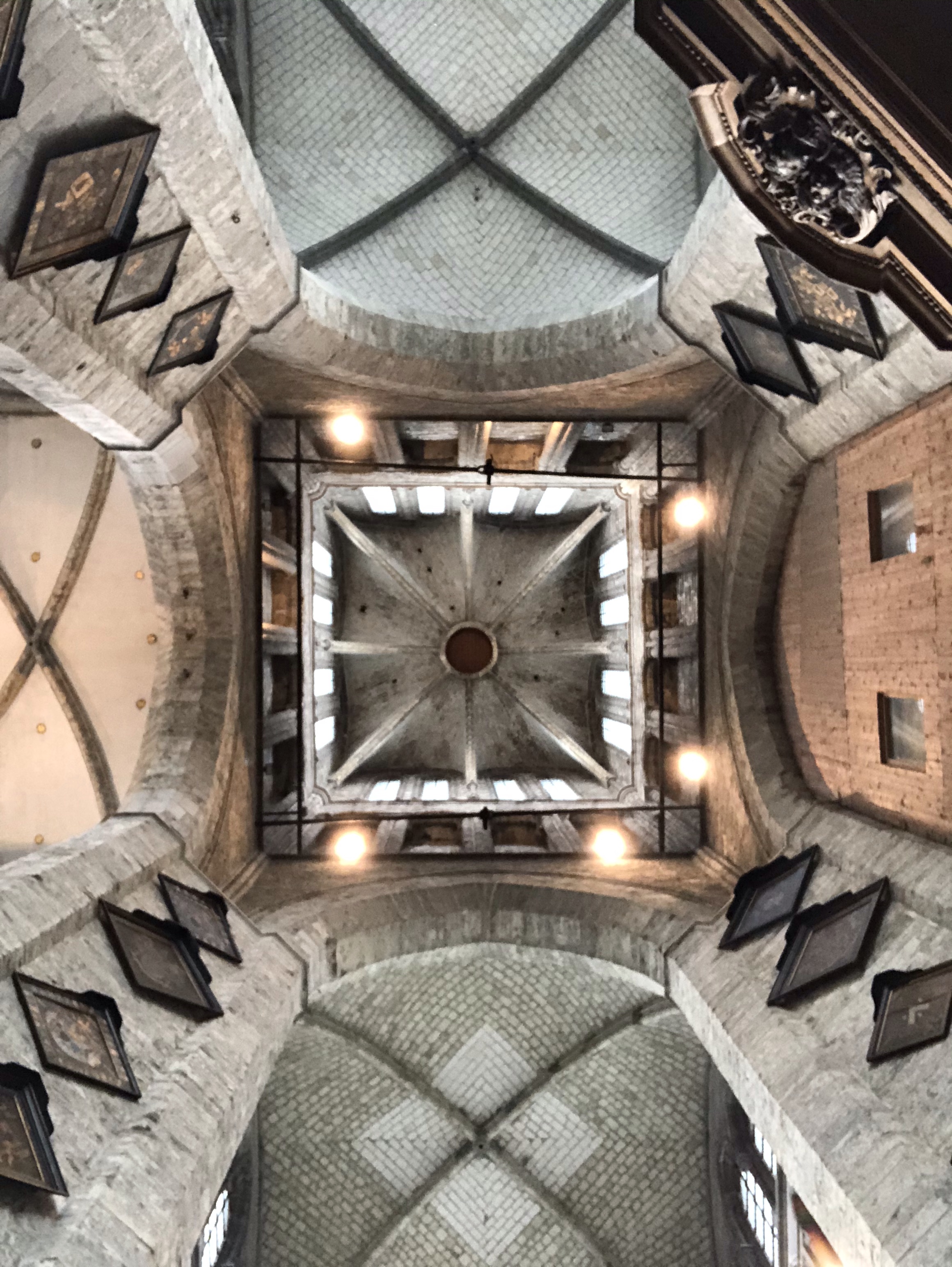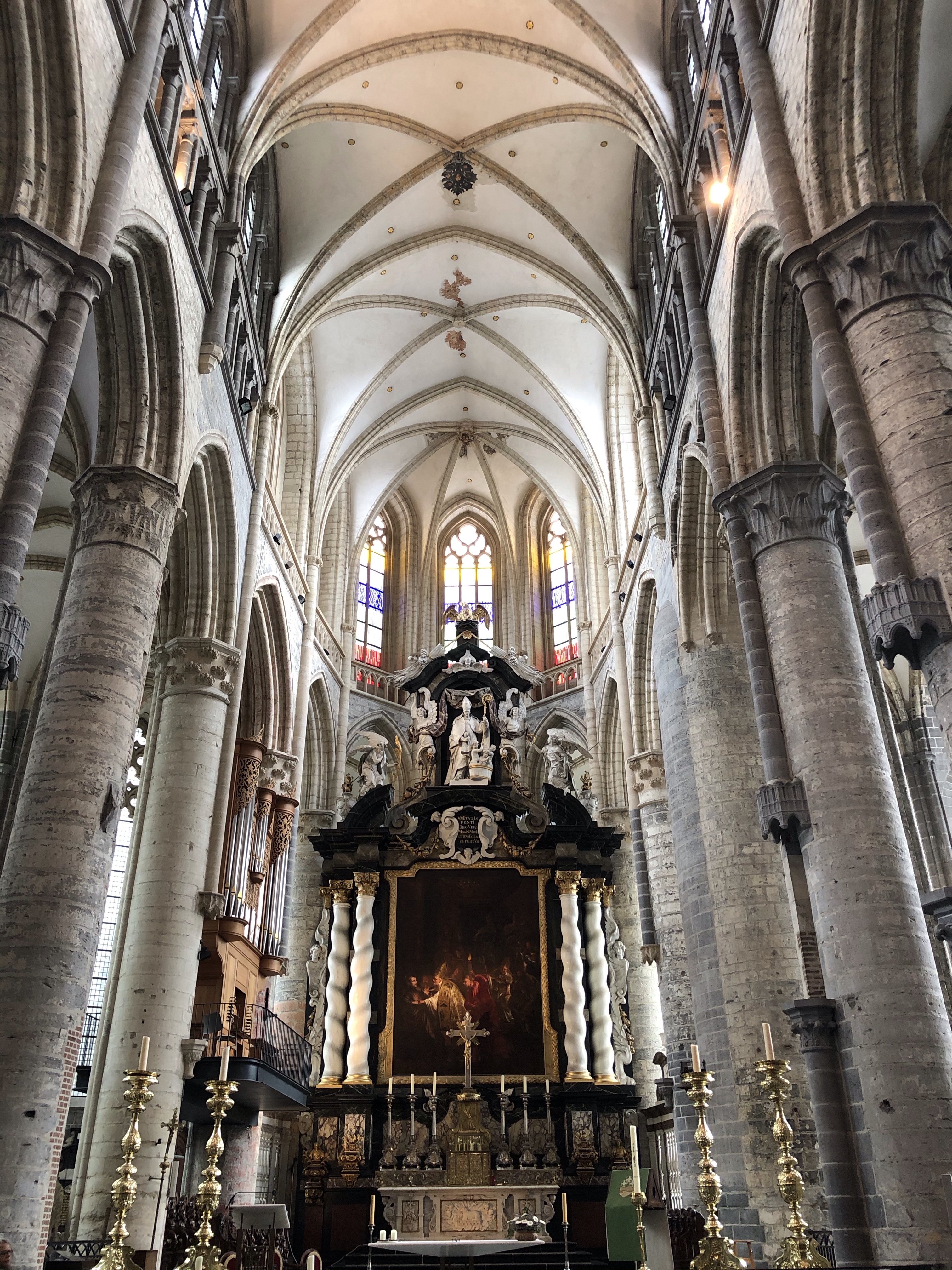 From here we quickly tour the Church of St. Nicholas (the rectangular tower), observe the Belfry (a dragon is on top), and spend most of our time in St. Bavo’s Cathedral. Along the way, the City Market Hall presents as a gathering place for locals and families on weekends to take in the sun, drink a Belgian beer, and listen to music. The reason we stopped in Ghent in the first place was the famous Ghent altarpiece. Just about everything that could ever happen has happened to this painting. Our amazing discovery was that St. Bavo’s is truly an art museum. While the altarpiece itself is located in the rear of the church and subject to strict lighting and atmospheric controls, there are many pieces of Flemish art presented in situ that are must sees. The piece itself is massive – 15 feet wide, 11 feet tall, a dozen separate panels fill with symbolism and rich details. There are no cameras allowed here, nor should there be. The altarpiece transports us to another time and place and we are awestruck. Even today, the art continues to astound.