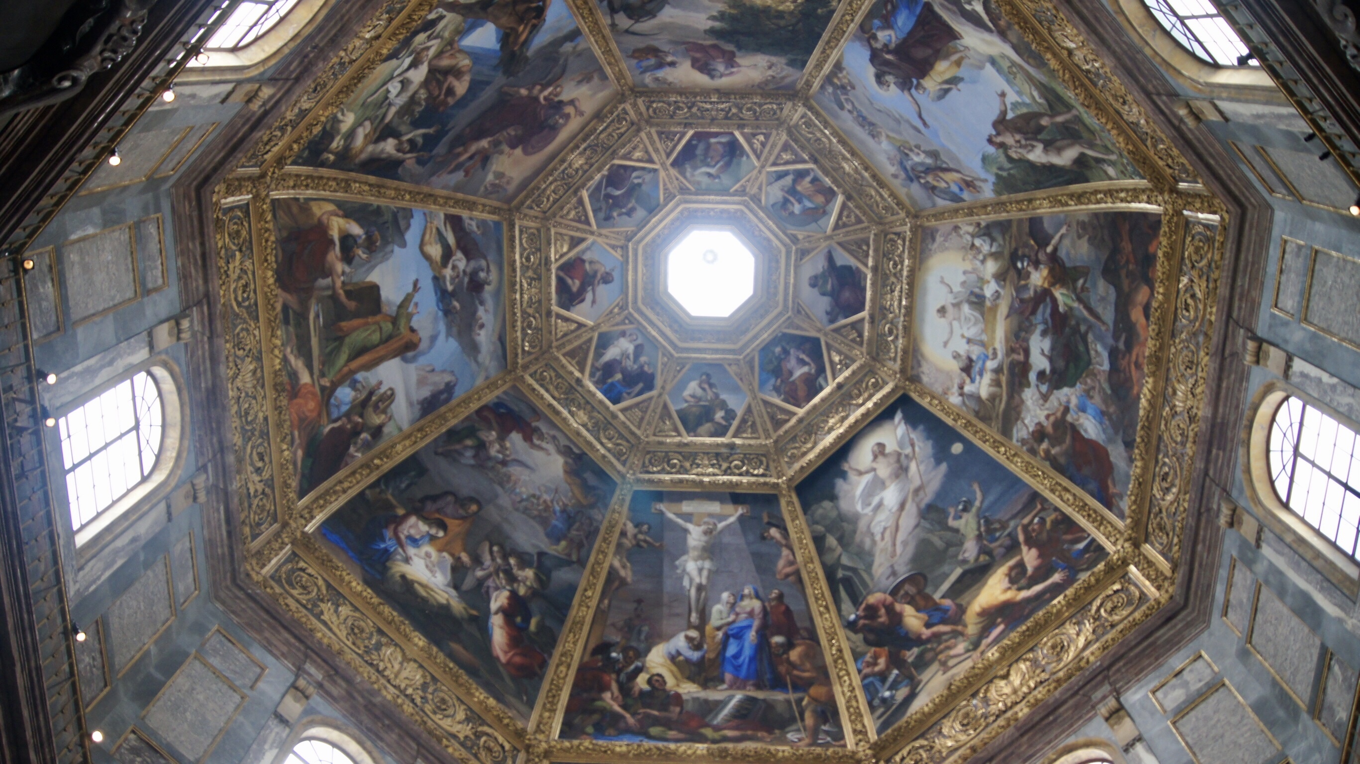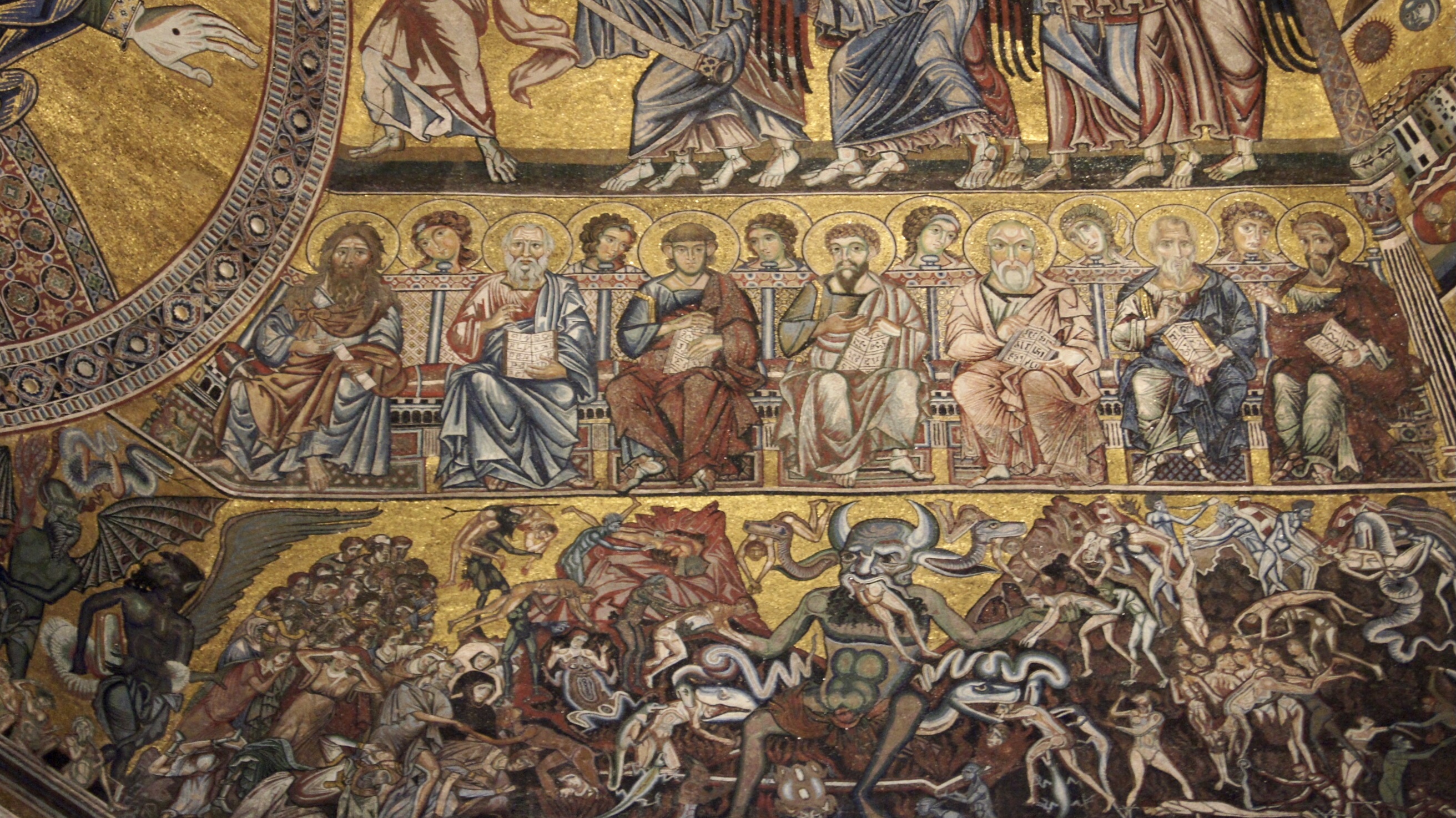 The Baptistery across the piazza is also a marvel of artistic splendor. The bronze doors of the octagon are themselves high art; Ghiberti used mathematical laws to create the illusion of receding distance on an otherwise flat surface. Inside take a quiet moment and marvel at the ceiling mosaics created by workers from St. Mark’s in Venice. The Last Judgment portrayed on the ceiling tells the story of judgment – saved on the left, damned on the right. Bring binoculars to take in some of the scenes. Our favorite were those on the hell side of the ledger — demons, monsters, and the like torturing the damned. The imagination of the artists just runs wild.