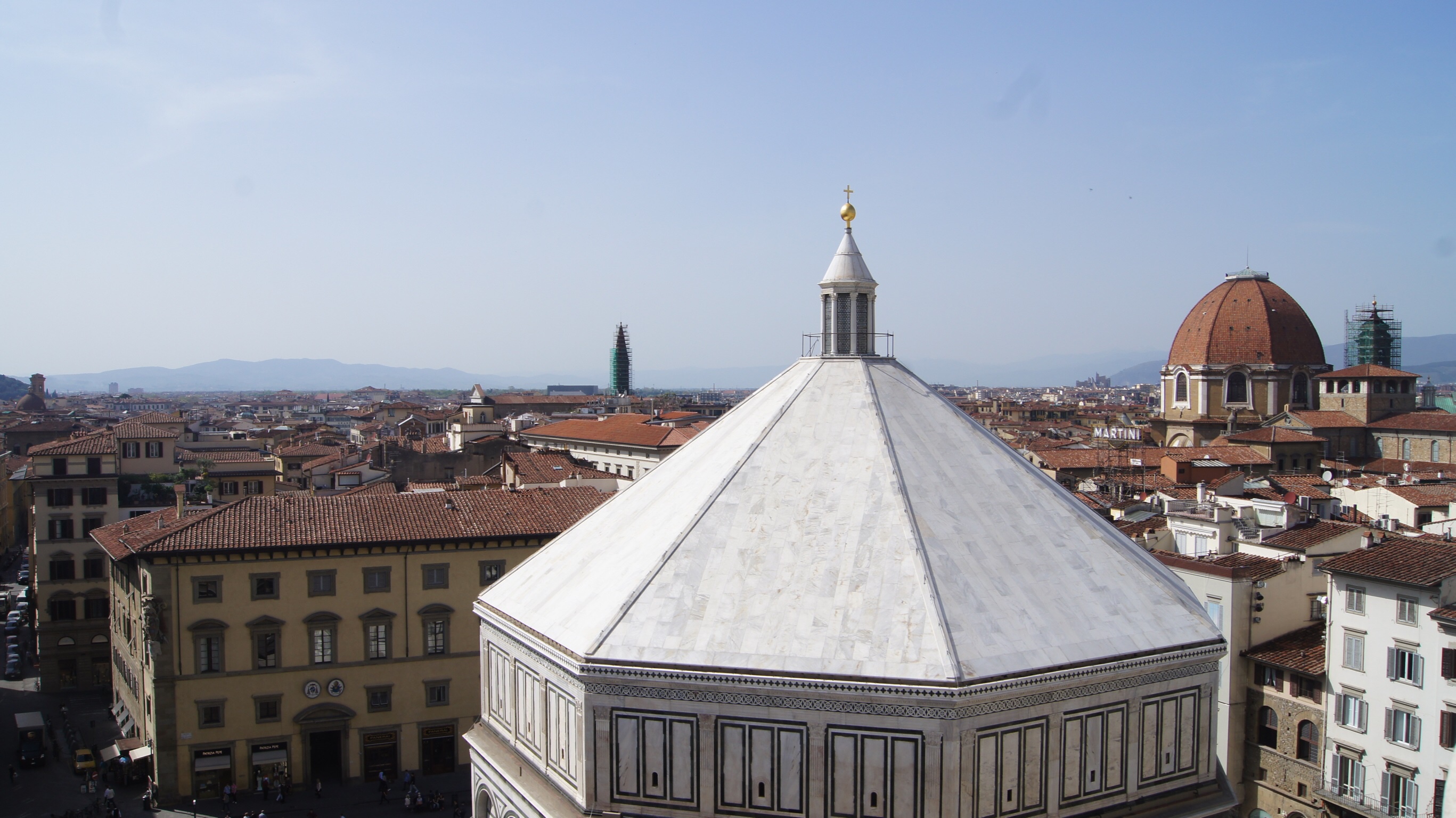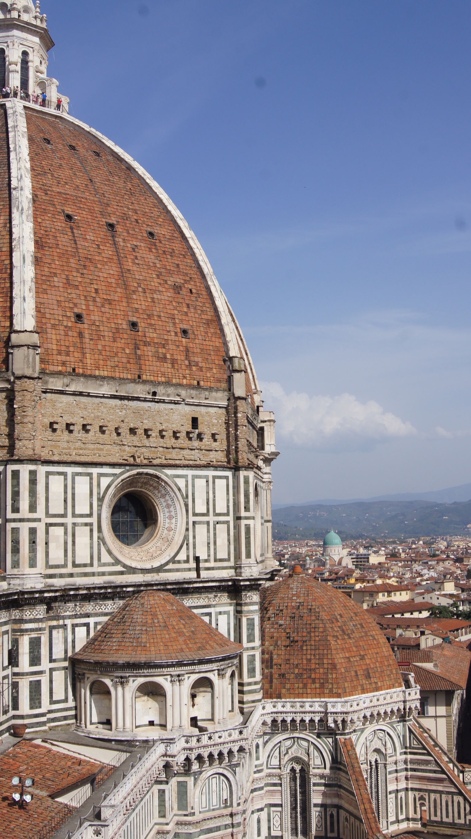 The Duomo, Baptistery, and Campanile. The Duomo, as referenced, is visible from all over Florence. The church is in the Gothic style and its exterior pink, green, and white striped marble are neo-Classical. The history of the church is fantastic; it was built in the Middle Ages with a giant hole in the roof waiting for technology to catch up and allow the dome to be built. Filipino Brunelleschi designed the dome within a dome in the 1400s, building off the architectural features of the Pantheon’s dome. The Duomo’s dome has been the model for Vatican City’s St. Peter’s and Washington DC’s Capitol. Inside the Duomo is not as impressive as the outside. Large as it is sparse, the better part of the visit is to climb to the dome or visit the Campanile, which the the adjacent 270-foot bell tower with masterful views of the Duomo and the surrounding city. If planning to climb the Palazzo Vecchio, most suggest climbing the Campanile to get up close views of the Duomo’s dome but obstructed views of the city. If you only want to climb one, most suggest the Duomo.