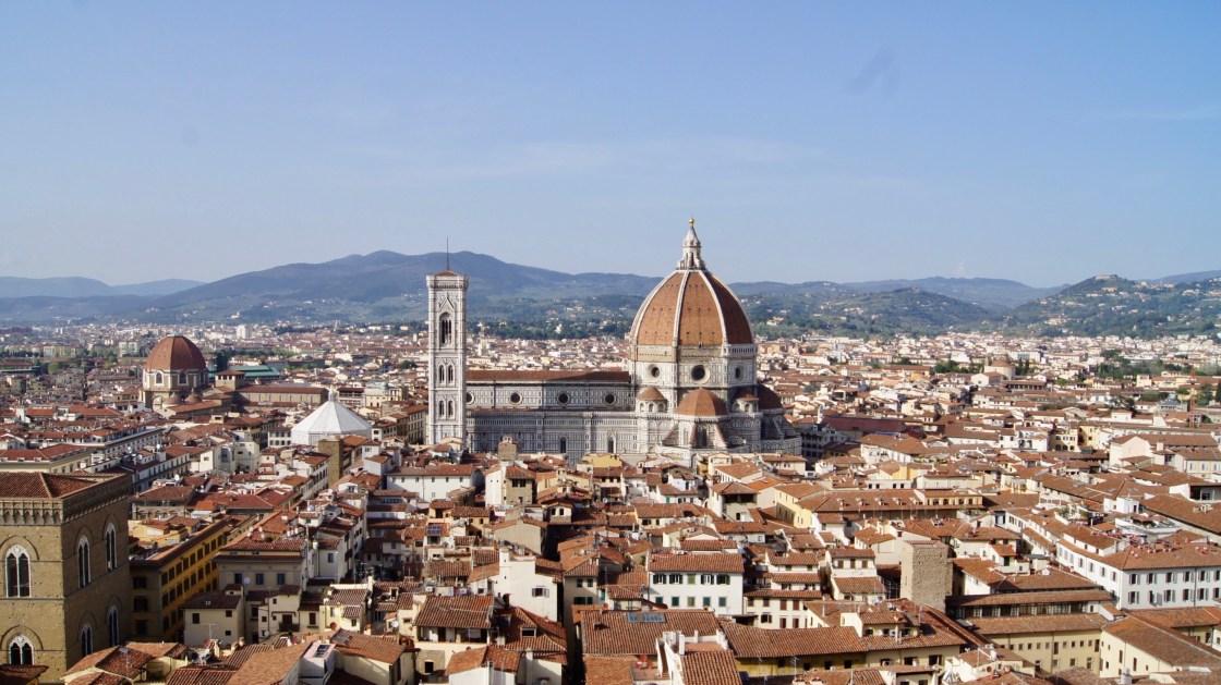 Arrival. We arrived on a direct flight to Rome’s Fiumicino airport, cleared Customs, quickly found the local train to Rome’s Termini station, and quickly changed to a high-speed train to Florence’s Santa Maria Novella (“SMN” on signage). Rome to Florence is a popular route with 22 trains per day and Italy’s high-speed rain is smooth, fast, and clean. Must be all that EU money. We touched down just after 9am and our train pulled in to SNC around 12:30pm. We’re still convinced that the train was the fastest — and cheapest — choice for this transfer. It also allowed us to see the beautiful scenery along the way (or nap) and then upon arrival in Florence walk, rolling suitcases over cobble stones, to the Rodo Hotel just steps away from the Duomo.