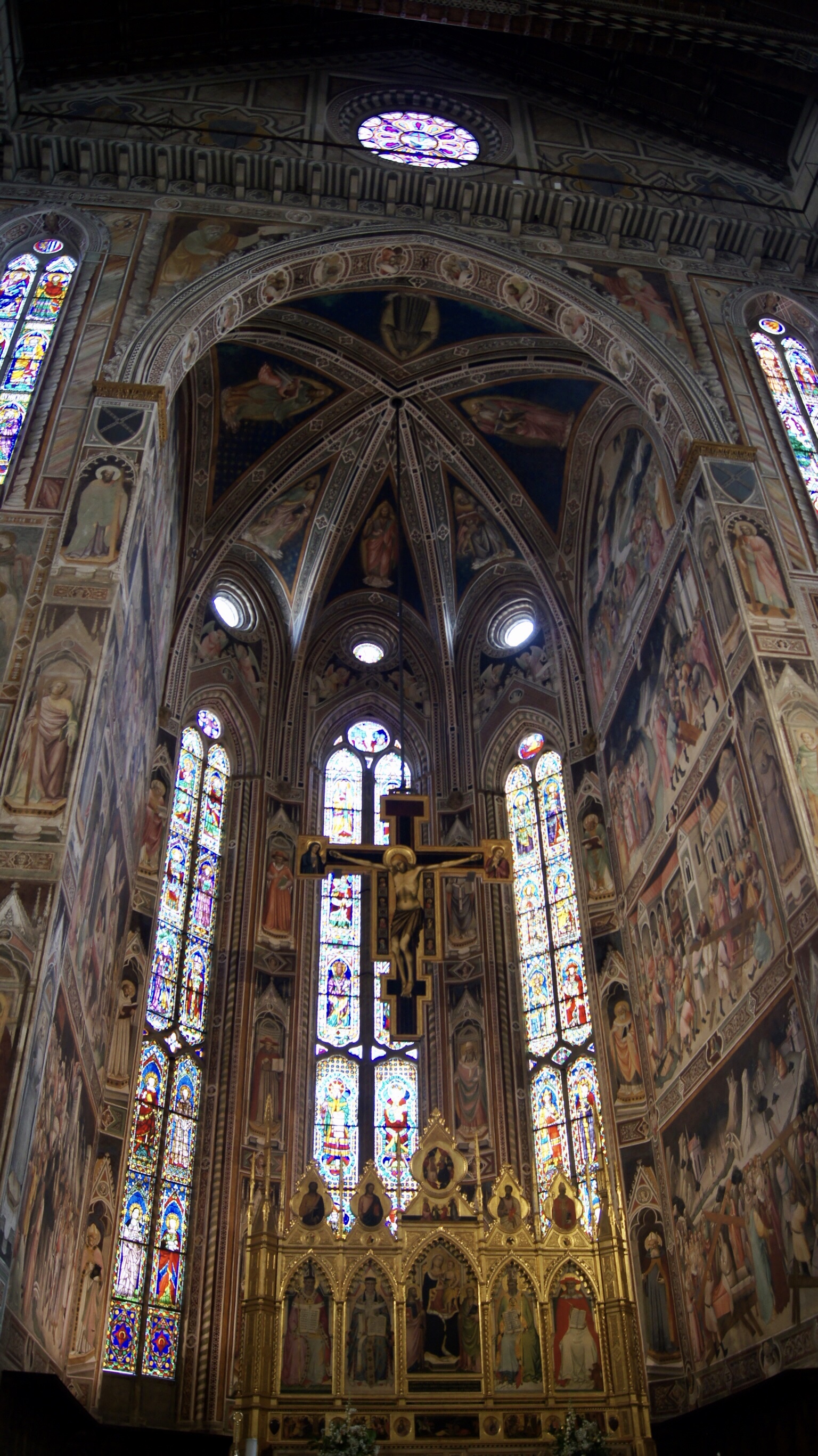 Every Florentine Who Is Any Florentine Goes to Santa Croce. Eventually, to be buried. Built in the early 14th century, this is one of the prettiest churches in all of Florence. Decorated with stunning green, pink, and white marble on the outside, the interior is sumptuous. Open wood beams cris-cross the ceiling and vibrant colors surround the altar. Here is where you can find the glitterati of Florence: Galileo, Dante, Michelangelo, Machiavelli, Donatello, Rossini. We meandered and stayed a while. One of our last stops within Florence.