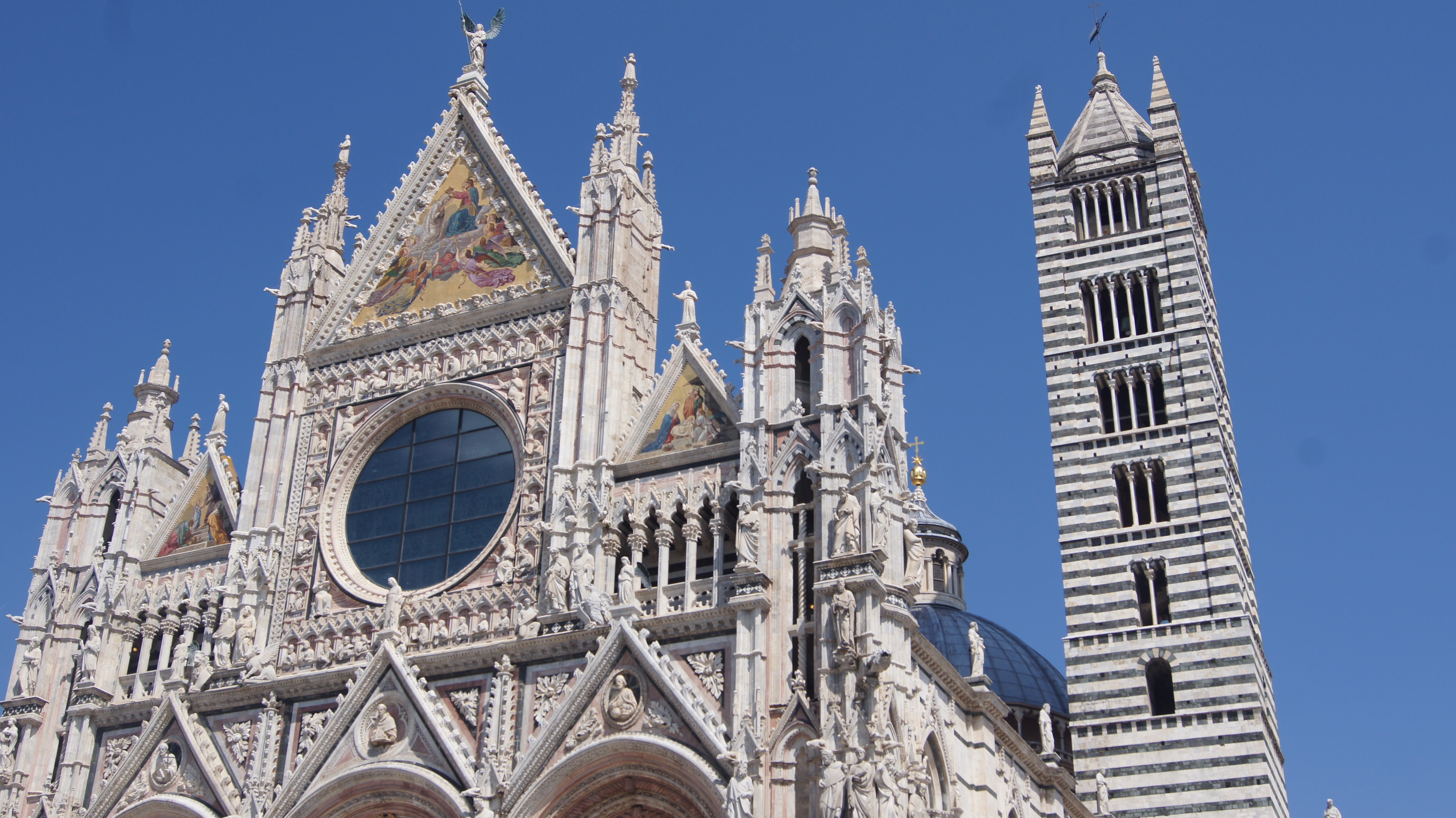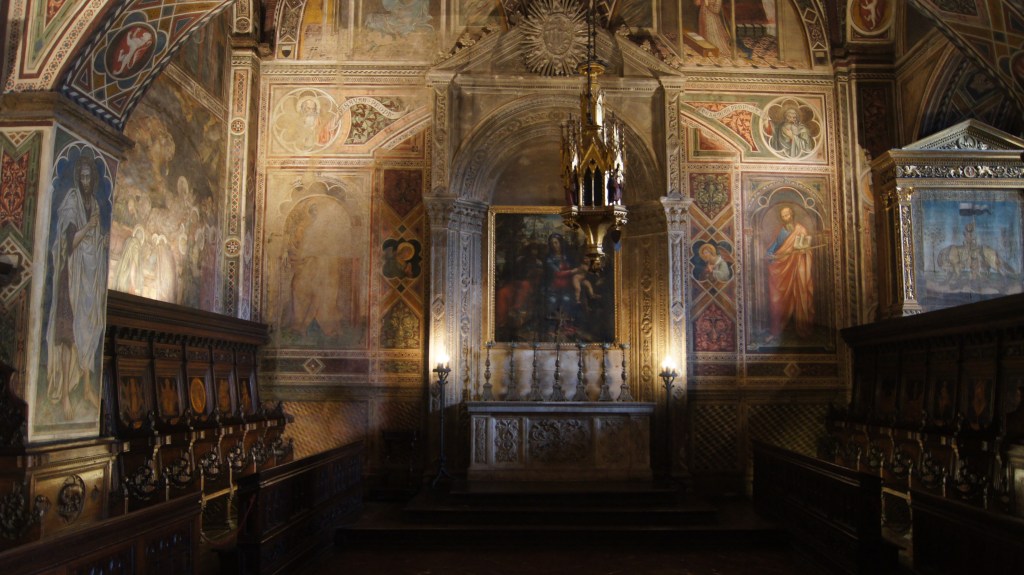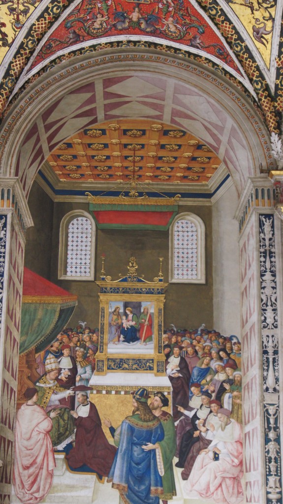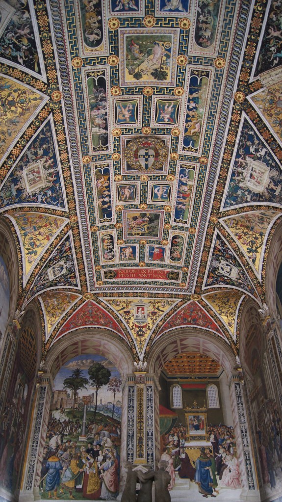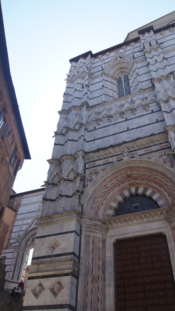 This may be one of our favorite churches that we have visited and that’s saying something considering the number of churches we’ve visited on our European adventures. The church has it all going on: a triptych-style façade, a forest of striped columns, Renaissance art, 15th century frescoes, and a massive stained-glass window, just to name a few of its unique features that mix Siena civic pride with religion (the contrade banners fly in the nave and art inlaid into the marble floor mixes scenes from the Old Testament with Sienese civic imagery).