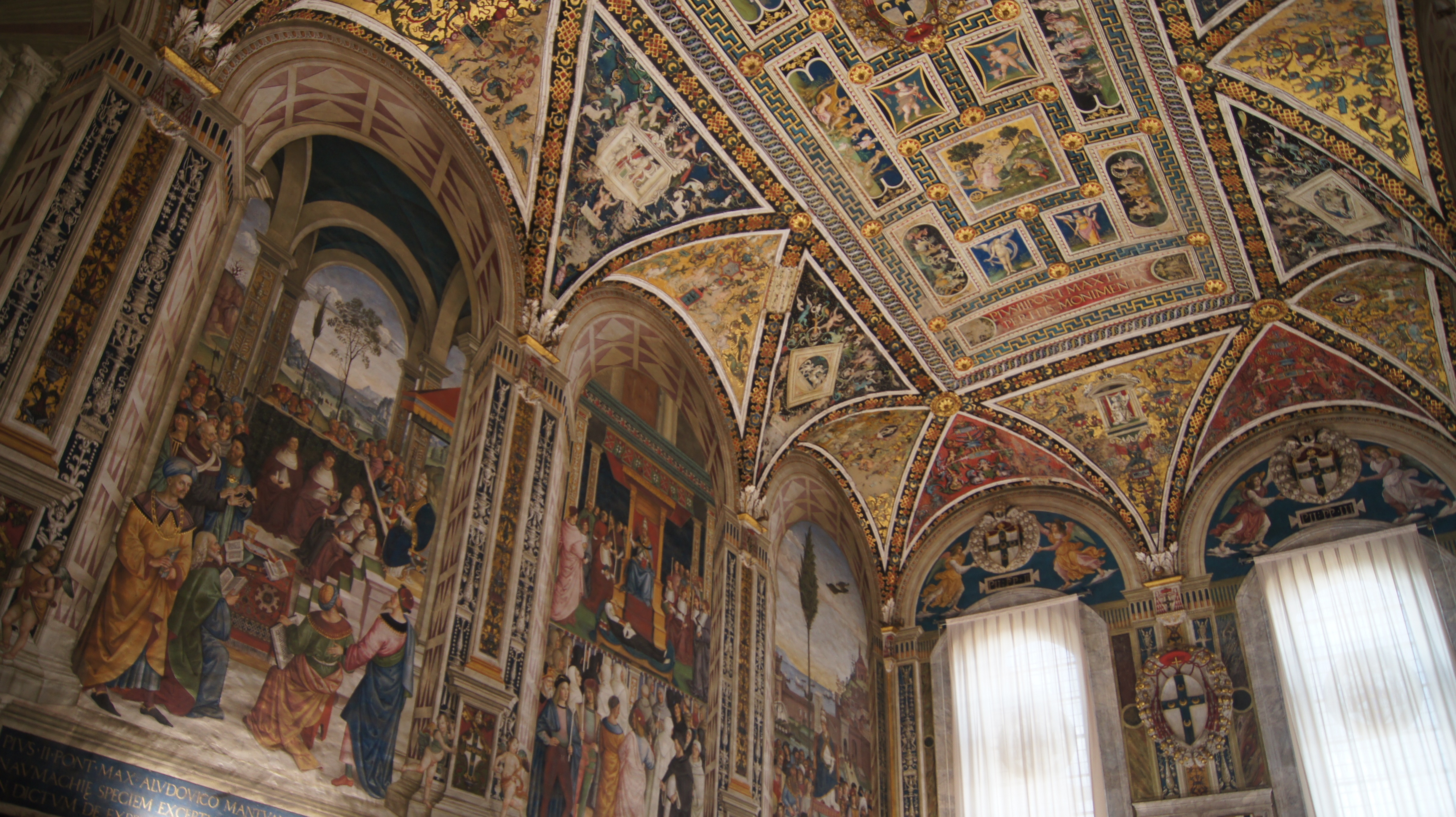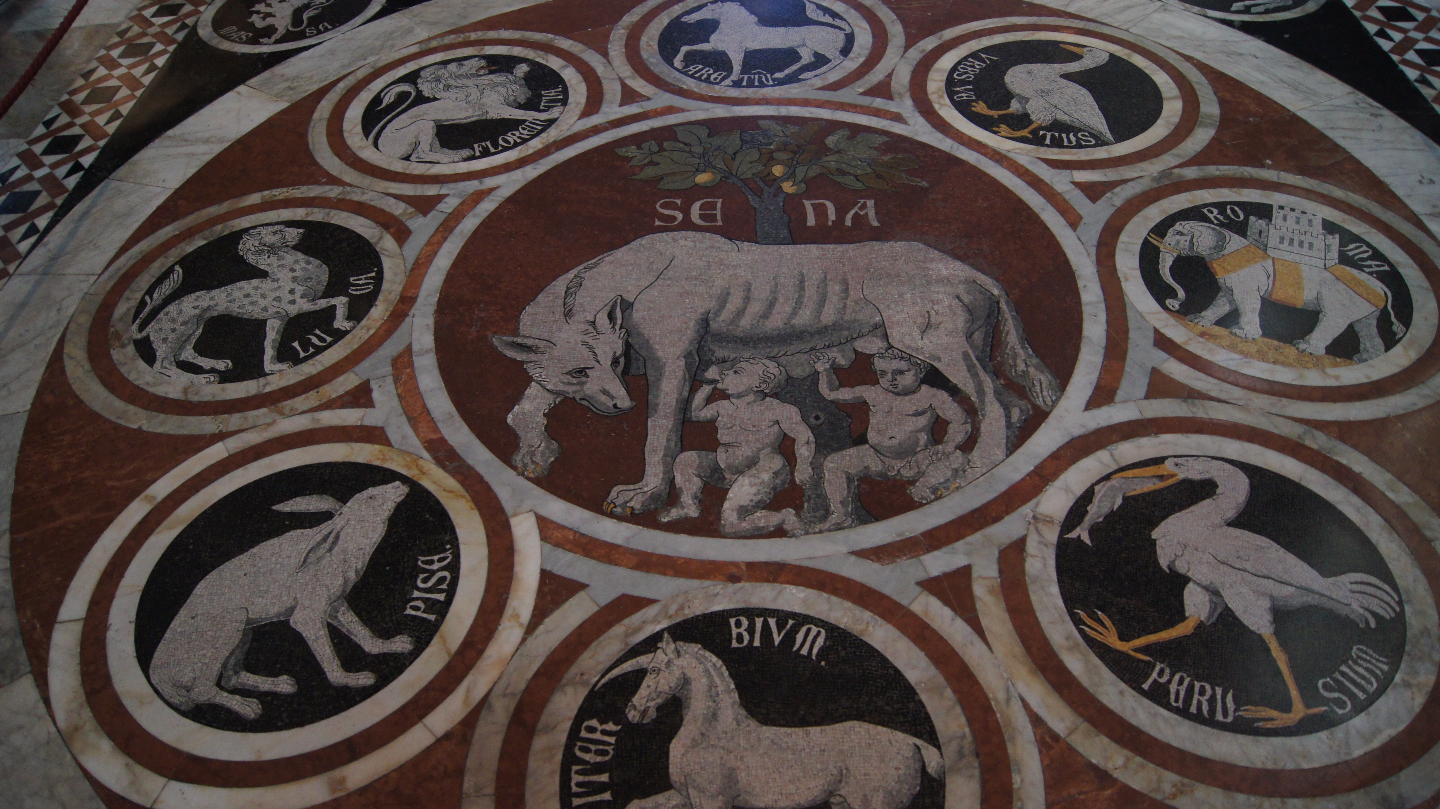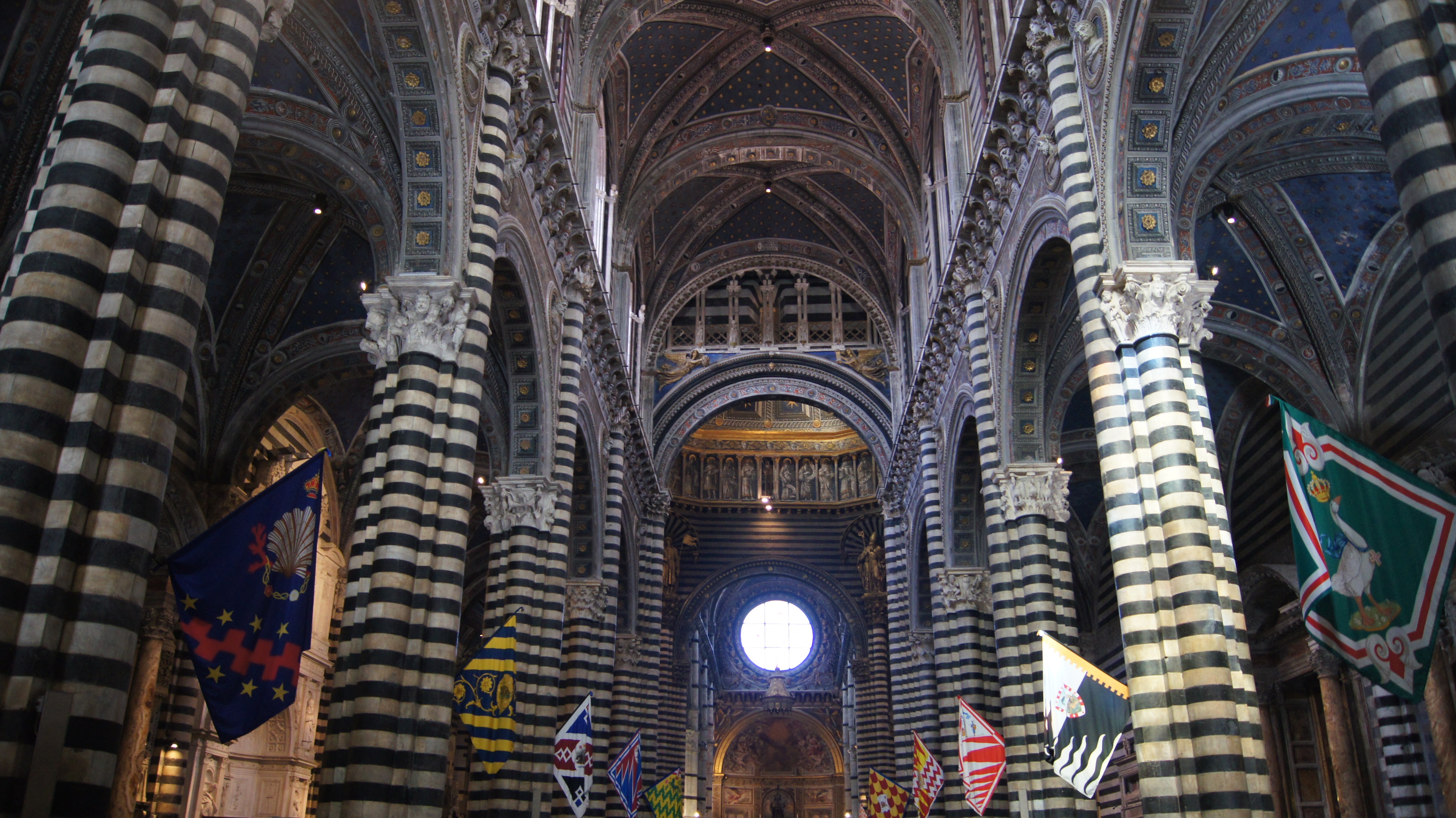 This may be one of our favorite churches that we have visited and that’s saying something considering the number of churches we’ve visited on our European adventures. The church has it all going on: a triptych-style façade, a forest of striped columns, Renaissance art, 15th century frescoes, and a massive stained-glass window, just to name a few of its unique features that mix Siena civic pride with religion (the contrade banners fly in the nave and art inlaid into the marble floor mixes scenes from the Old Testament with Sienese civic imagery).