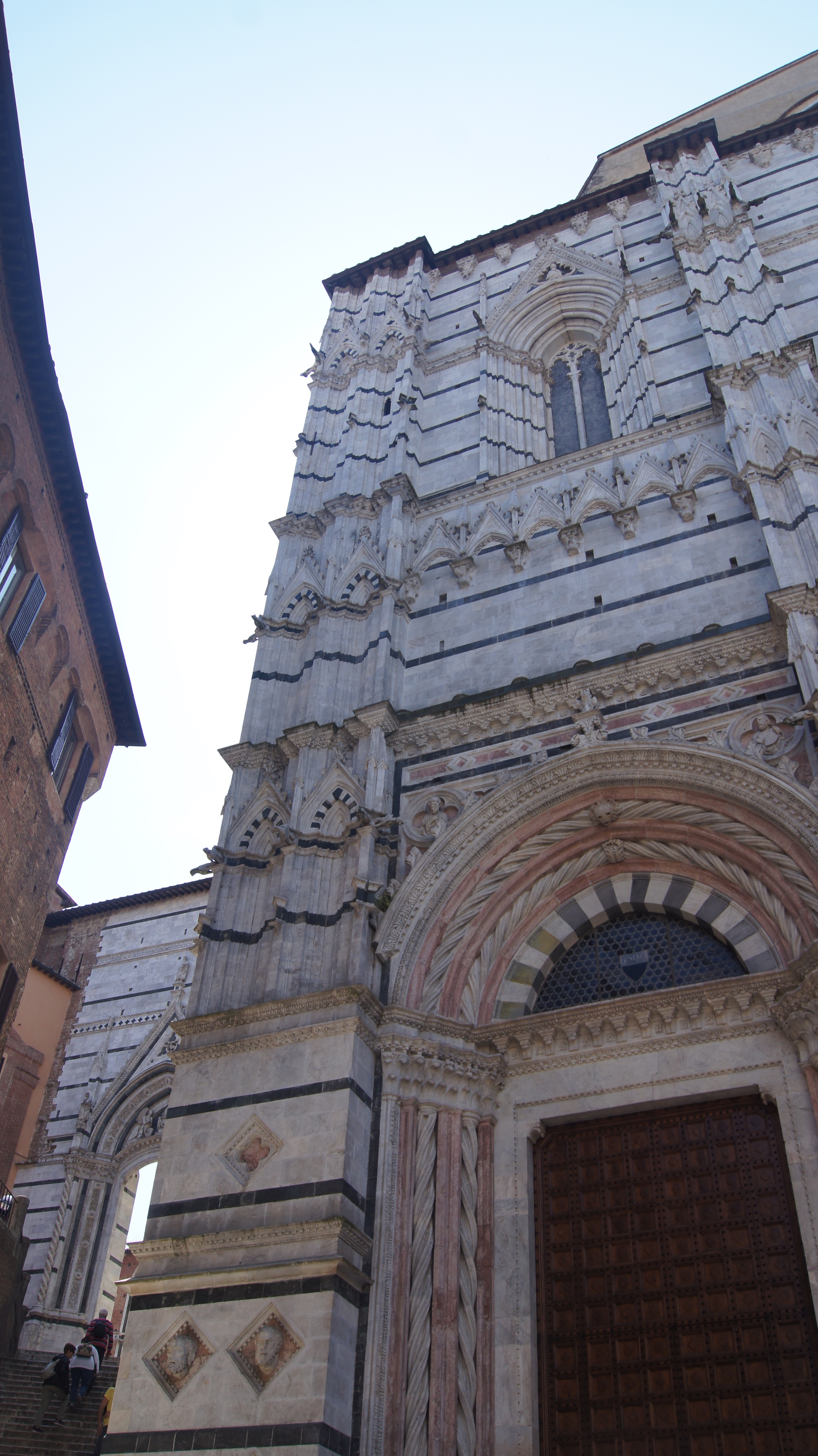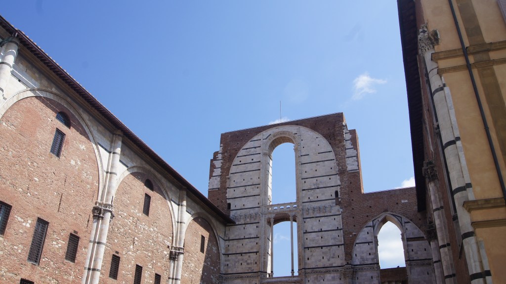 Second is that Siena’s Duomo remains unfinished. As Siena intended to rival Florence, the city wanted to build a massive Duomo. But Siena is a hill town and there was not enough flat land for the size of the cathedral. So the city built the Duomo to hang over the hillside and built the baptistry underneath to support one end of the church. The current nave was supposed to be the transept and the piazza is where the nave was intended to be. There remains an unfinished wall at the far end of the piazza from when the design was abandoned after the Black Death ravaged Siena.