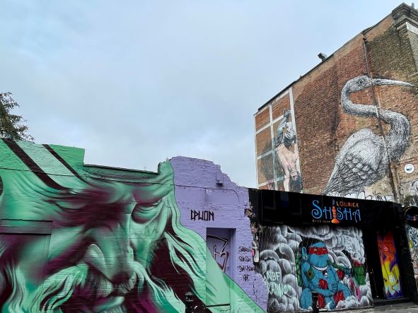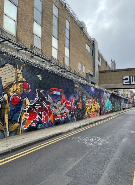 Sunday. It’s another market day for us. We grab the tube and journey east toward Brick Lane (tube stop Aldgate East). Brick Lane is known for its curries and the revitalized Truman Brewery is solid gold for vintage shopping. It’s crowded here on the weekends with the market stalls open and the vintage shops are packed. One of our favorite things to do in the area while the baby napped was to walk the streets and take in the street art.