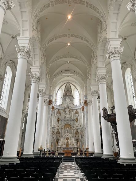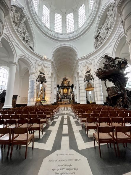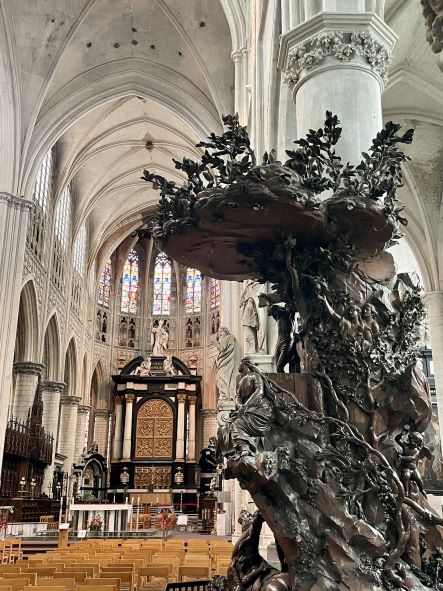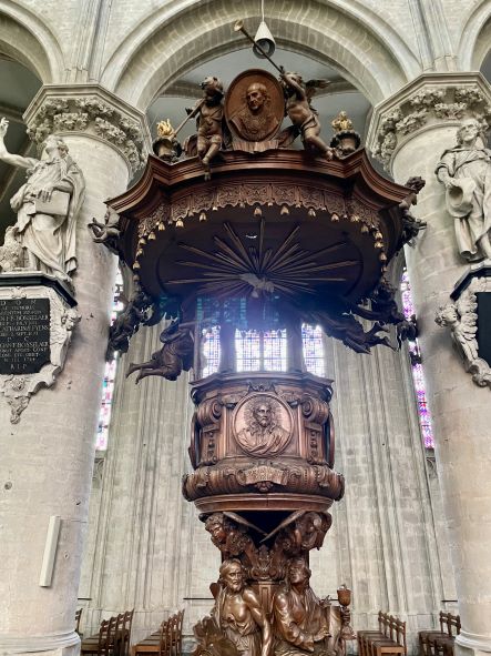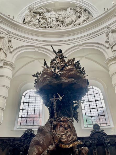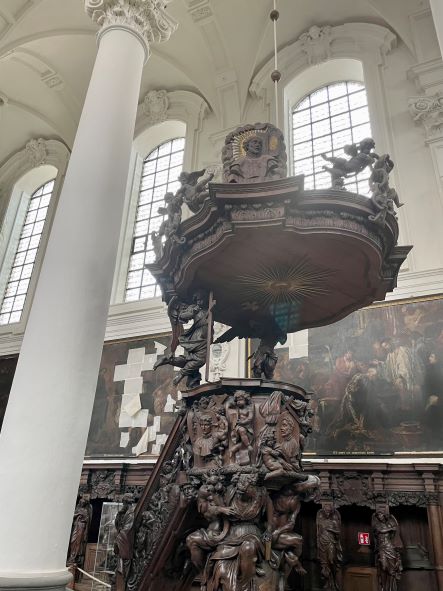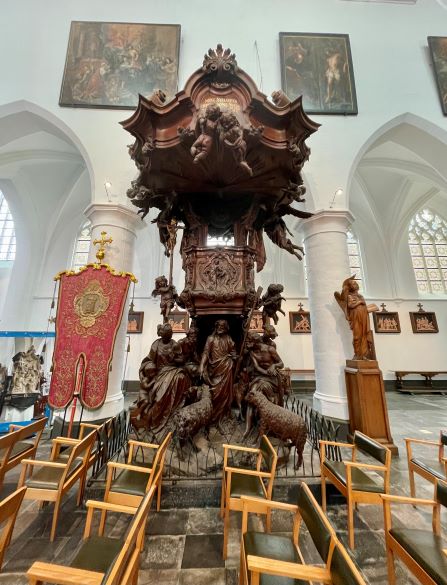 Beguinage Church. Just around the corner from the Het Anker is the seventeenth-century Beguinage Church. The church has a beautiful Italian baroque façade. At each of the churches we visit, the wooden carved pulpits are simply stunning.