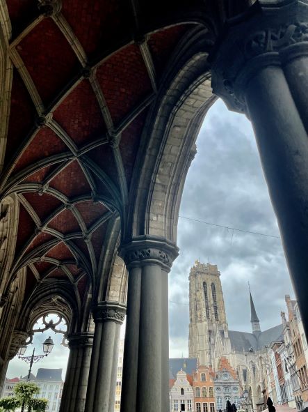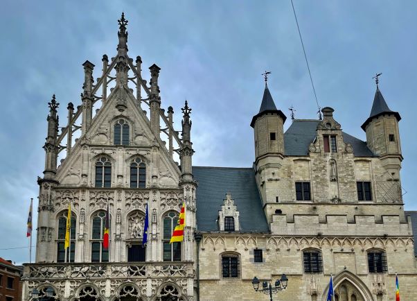 Arrival and walk to the Grote Markt. Mechelen’s train station has been party modernized and, while certain parts are sparse, there are four tracks with brand new platforms. The walk from the station to the city center is easy and flat. The old town is encircled by the River Dyle and quickly, Mechelen’s charm is apparent with a pretty bridge and footpath over the river. We walk to Grote Markt, which is the central square in the historic centre. On one side of the square is the domineering St. Rumbold’s Tower and on the other is the gilded Town Hall. The houses around the Grote Markt are from different times and built in different styles, from sixteenth-century renaissance to eighteenth-century rococo.