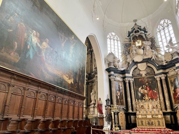 St. John’s Church. By contrast to St. Catherine’s, the parish where St John’s is located was one of the richest parishes in Mechelen because the members of the Great Council lived there. The Great Council was the highest court of law in the Low Countries from the fifteenth century (first under the name Parliament of Mechelen) and it remained in existence until the French Revolution. Built in above the altar is Peter Paul Rubens’ famous baroque triptych. Behind the side panels is a mechanism for turning the paintings at regular intervals so that all the scenes can be admired.